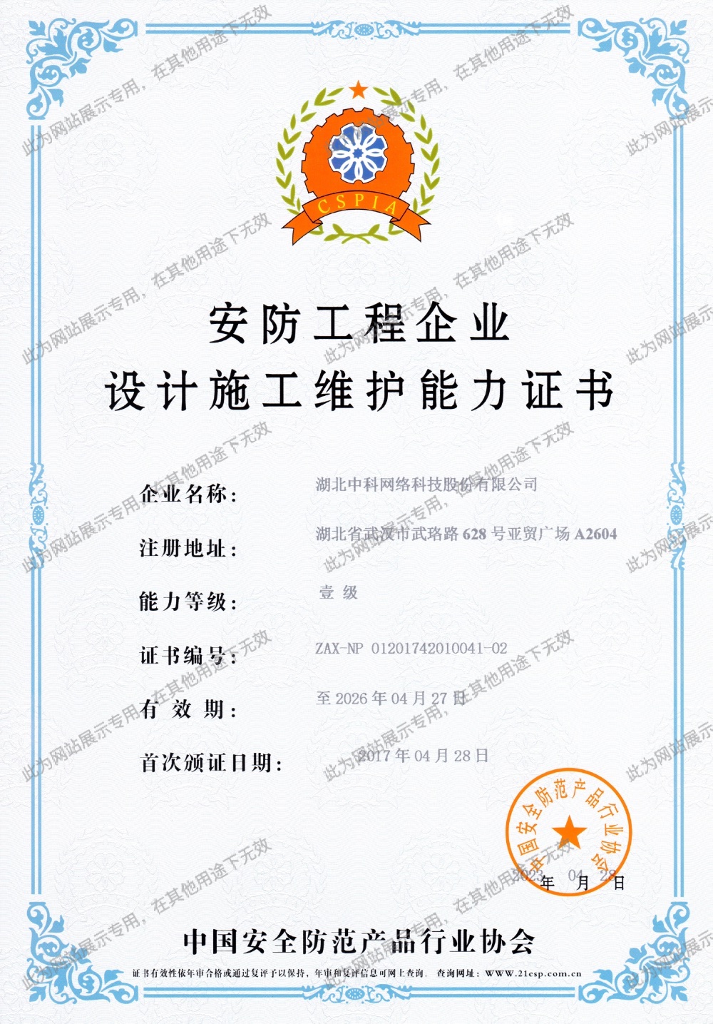 • 國家安防工程企業(yè)壹級資質(zhì)